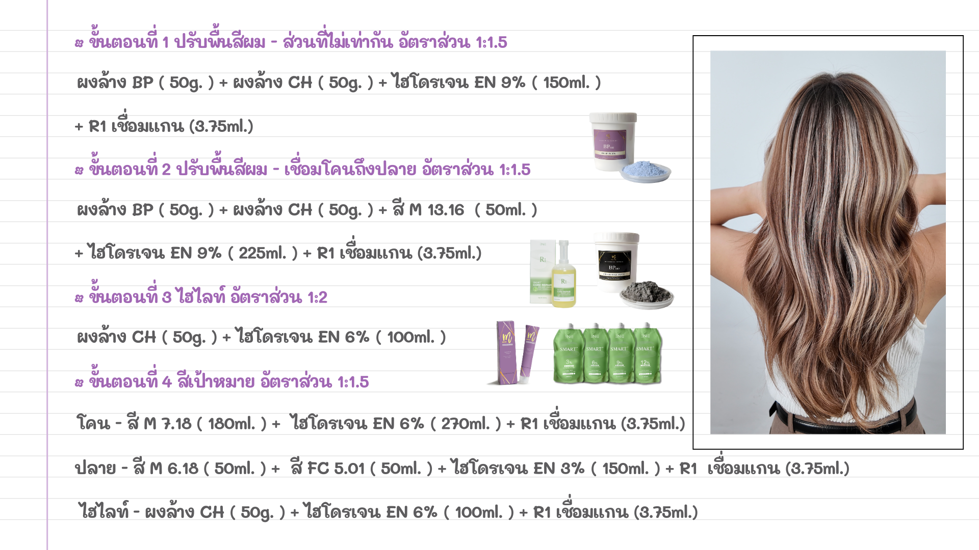 โคน: สี M 7.18 ( 180ml. ) + ไฮโดรเจน EN 6% ( 270ml. ) + R1 เชื่อมแกน (3.75ml.)ปลาย: สี M 6.18 ( 50ml. ) + สี FC 5.01 ( 50ml. ) + ไฮโดรเจน EN 3% ( 150ml. ) + R1 เชื่อมแกน (3.75ml.)