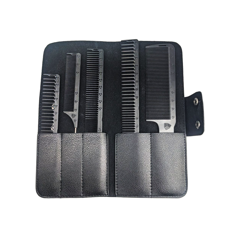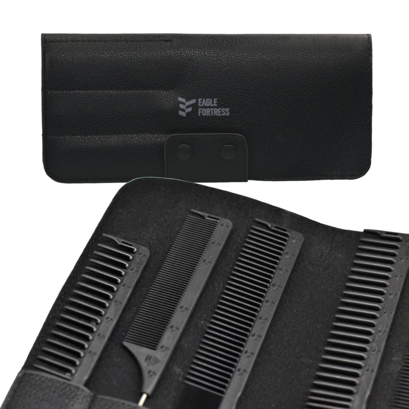 - กระเป๋าจัดเก็บพกพาสะดวก: มาพร้อมกระเป๋าหนังเทียม (PU Leather) ดีไซน์เรียบหรูสีดำ มีช่องแยกสำหรับจัดเก็บหวีแต่ละชิ้นอย่างเป็นระเบียบ พร้อมตัวล็อกกระดุมที่แน่นหนา ช่วยให้การพกพาและควบคุมอุปกรณ์ทำได้อย่างมืออาชีพ