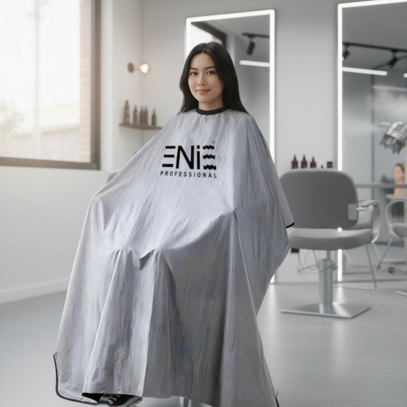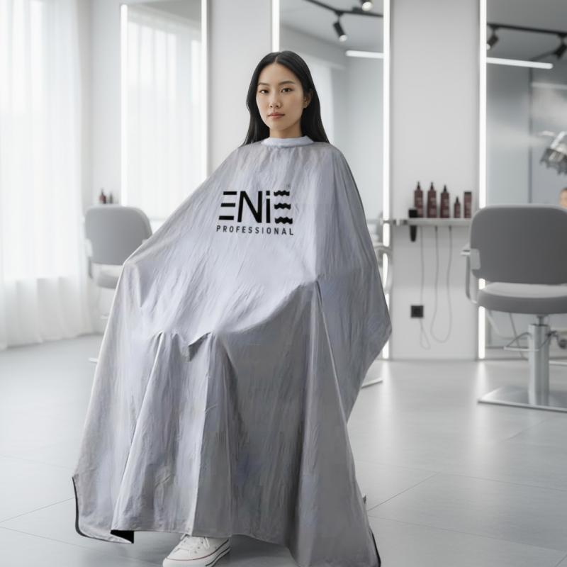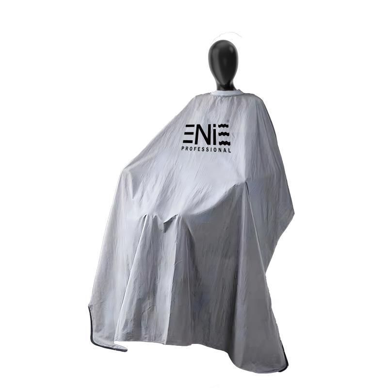 ผ้าคลุมตัดผมรุ่นมาตรฐานในโทนสีเทา ให้ลุคที่ดูสว่างและทันสมัย เหมาะสำหรับร้านที่ต้องการบรรยากาศที่ดูโปร่งและสะอาดตา พร้อมการสกรีนโลโก้ ENIE PROFESSIONAL ที่หน้าอก