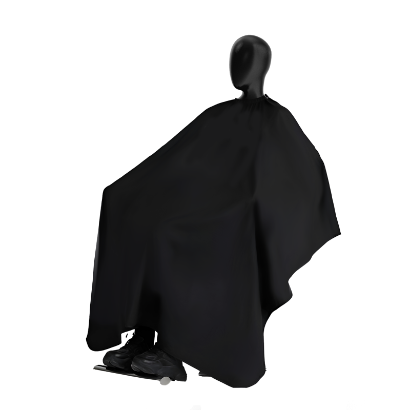 ผ้าคลุมตัดผมคุณภาพมาตรฐาน ดีไซน์เรียบง่ายสีดำล้วน เหมาะสำหรับร้านบาร์เบอร์ ร้านเสริมสวย หรือใช้งานส่วนตัวที่บ้าน เน้นความคล่องตัวและความสะอาดเป็นหลัก