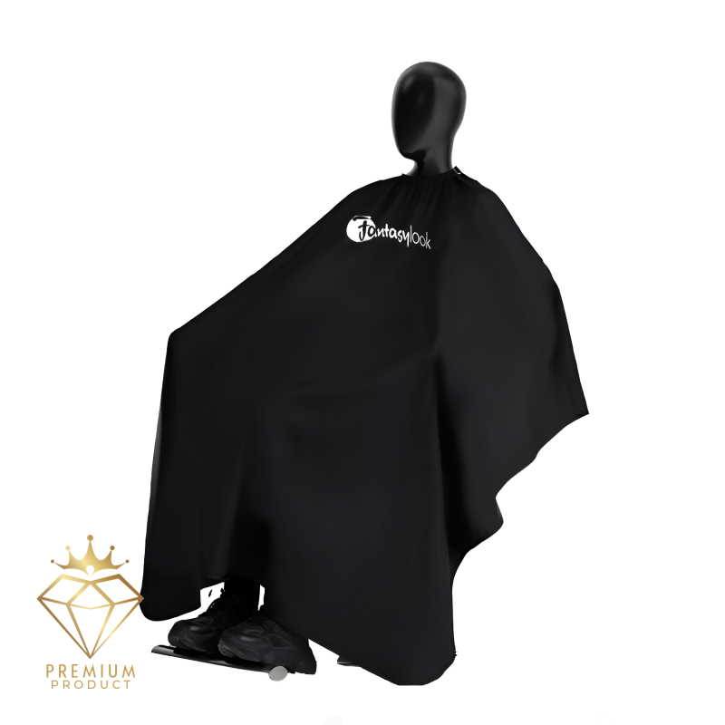 ผ้าคลุมตัดผมรุ่นพรีเมี่ยมสีดำล้วน โดดเด่นด้วยงานสกรีนลาย Fantasy บริเวณด้านหน้า ให้ลุคที่ดูทันสมัยและเป็นมืออาชีพ ตัวผ้าเน้นคุณภาพสัมผัสที่นุ่มลื่น เพื่อความสบายของลูกค้าขณะรับบริการ
